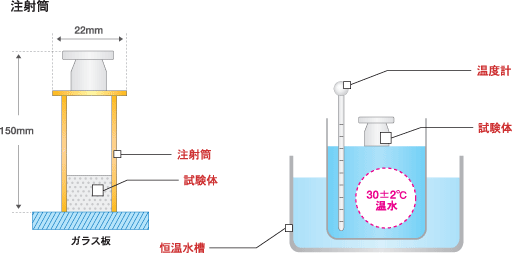 「セルロースファイバー」を注射筒に充てんし、圧縮してできた円筒試験片を恒温水槽に水平に浮かし、1時間後に観察します。はっ水剤を添加した「セルロースファイバー」は、1時間後も何の変化も見られず水槽に浮いていました。