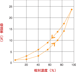 一般に吸放湿性のある材料は、含湿性能が大きく湿気容量も大きいものとされています。結露が生じても、その水分を材料内部へ拡散してしまい、表面に水滴として現れるのに時間がかかるという利点があります。