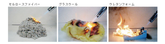 セルロースファイバーはホウ素系薬品により、充分な防燃処理がなされており、準不燃材料に合格しています。また、万が一燃えても、有害物質を発生せず、燃え広がるのに時間がかかります。その他、防虫の性質も持っています。