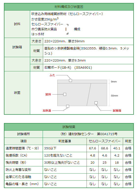 「セルロースファイバー」はJISA1321(建物内の内装材料および工法の難燃性試験方法)に規定する難燃3級の表面試験に合格しています。